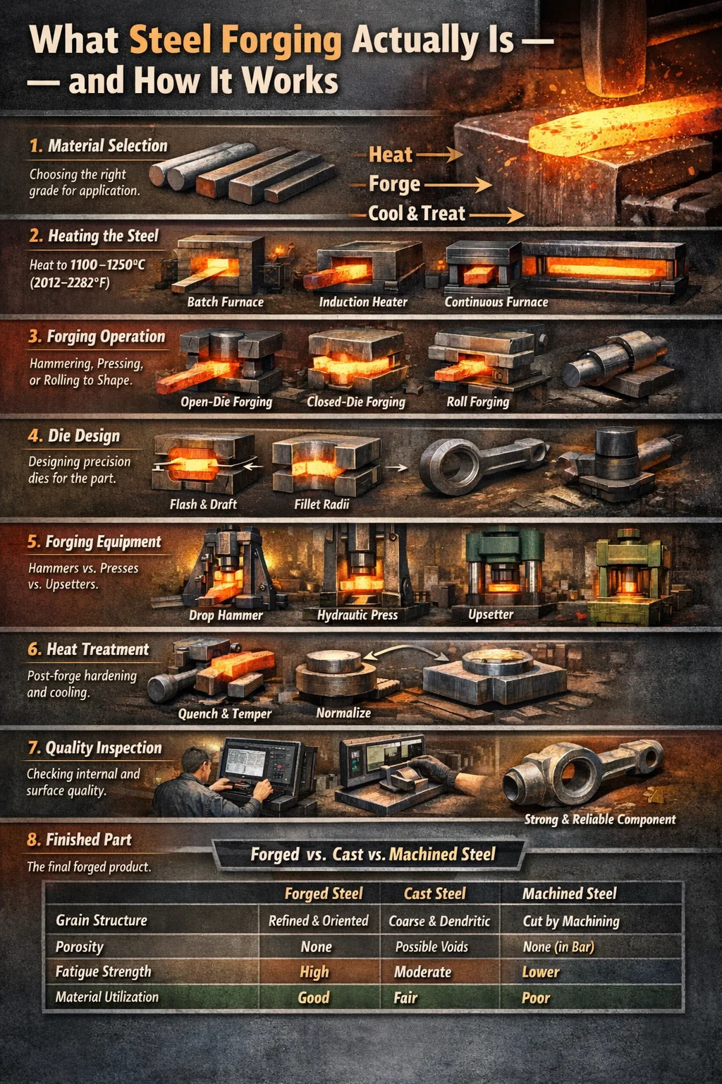 تزوير الصلب هي عملية تشكيل الفولاذ من خلال تطبيق قوة الضغط - إما عن طريق الطرق أو الضغط أو الدرفلة - بينما يتم تسخين المعدن إلى درجة حرارة بين 1100 درجة مئوية و1250 درجة مئوية (2012 درجة فهرنهايت إلى 2282 درجة فهرنهايت) . عند هذا النطاق، يصبح الفولاذ من البلاستيك بدرجة كافية ليتشوه دون أن يتشقق، ومع ذلك فإنه يحتفظ بالبنية الحبيبية التي تمنح الأجزاء المطروقة قوتها الميكانيكية الفائقة. والنتيجة هي مكون أكثر كثافة من الناحية الهيكلية وأقوى وأكثر مقاومة للتعب من أي شيء مصبوب أو مصنوع آليًا من مخزون القضبان.