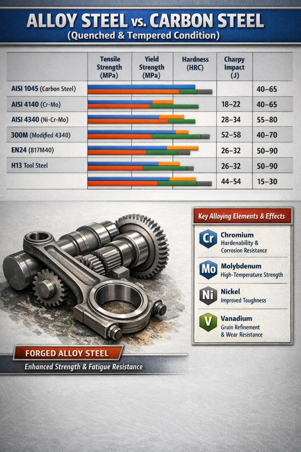 تختلف بيانات الخواص الميكانيكية لسبائك الفولاذ بشكل كبير اعتمادًا على الدرجة وحجم القسم وحالة المعالجة الحرارية. يقارن الجدول أدناه العديد من درجات سبائك الفولاذ المستخدمة على نطاق واسع في ظروف المعالجة الحرارية النموذجية إلى جانب الفولاذ الكربوني المرجعي للسياق.