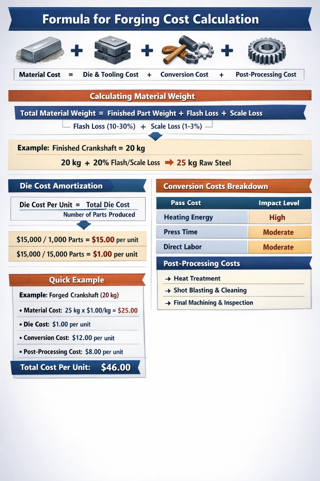 حساب التكلفة الإجمالية تزوير الصلب يتضمن جمع أربع ركائز أساسية: تكلفة المواد (الوزن الصافي بالإضافة إلى خسارة الفلاش)، تكاليف الأدوات/الموت (يتم إطفاؤها على مدى فترة الإنتاج)، تكلفة التحويل (الطاقة والعمالة والنفقات العامة للآلات). تكاليف ما بعد المعالجة (المعالجة الحرارية والتصنيع الآلي). بالنسبة للعتاد القياسي متوسط الحجم، تمثل المادة عادة ما بين 40% إلى 50% من إجمالي سعر الوحدة، في حين أن الأدوات هي أكبر متغير مقدم.