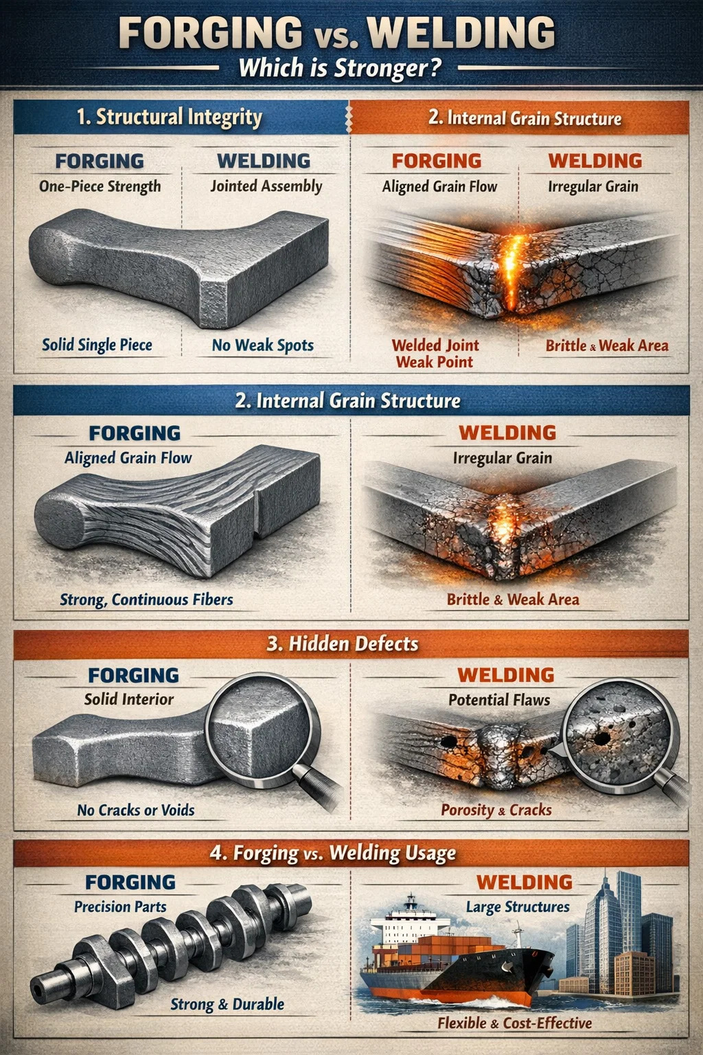 التكلفة: اللحام مناسب للهياكل الكبيرة والمعقدة، بينما يعتبر الحدادة أكثر ملاءمة للمكونات الدقيقة والقوية.