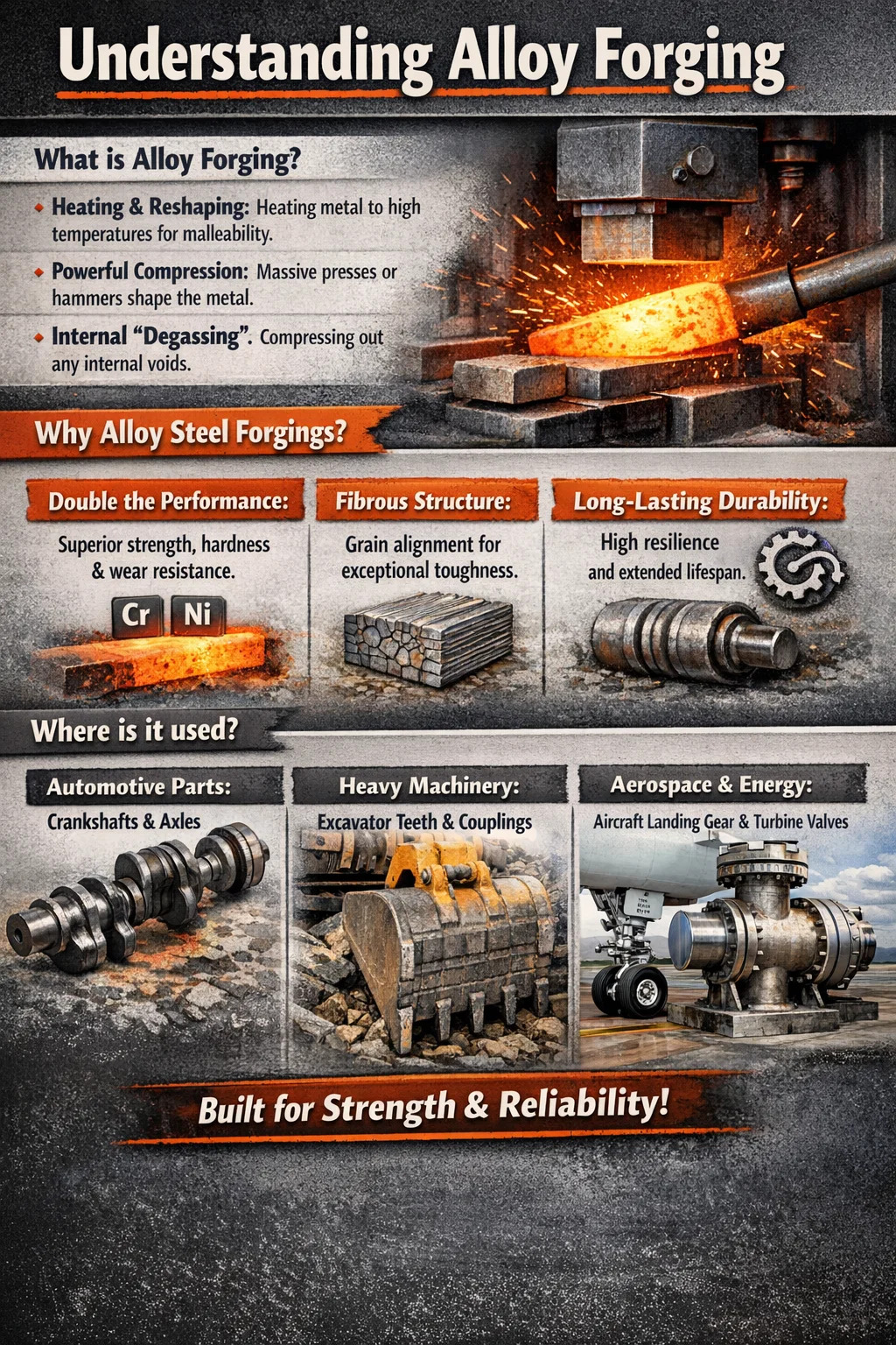 تزوير السبائك هو عملية تشكيل سبائك الفولاذ إلى أشكال محددة باستخدام طريقة "العمل الساخن". وهذا لا يغير الشكل فحسب، بل يجعل المعدن أقوى وأكثر ليونة من خلال الضغط القوي.